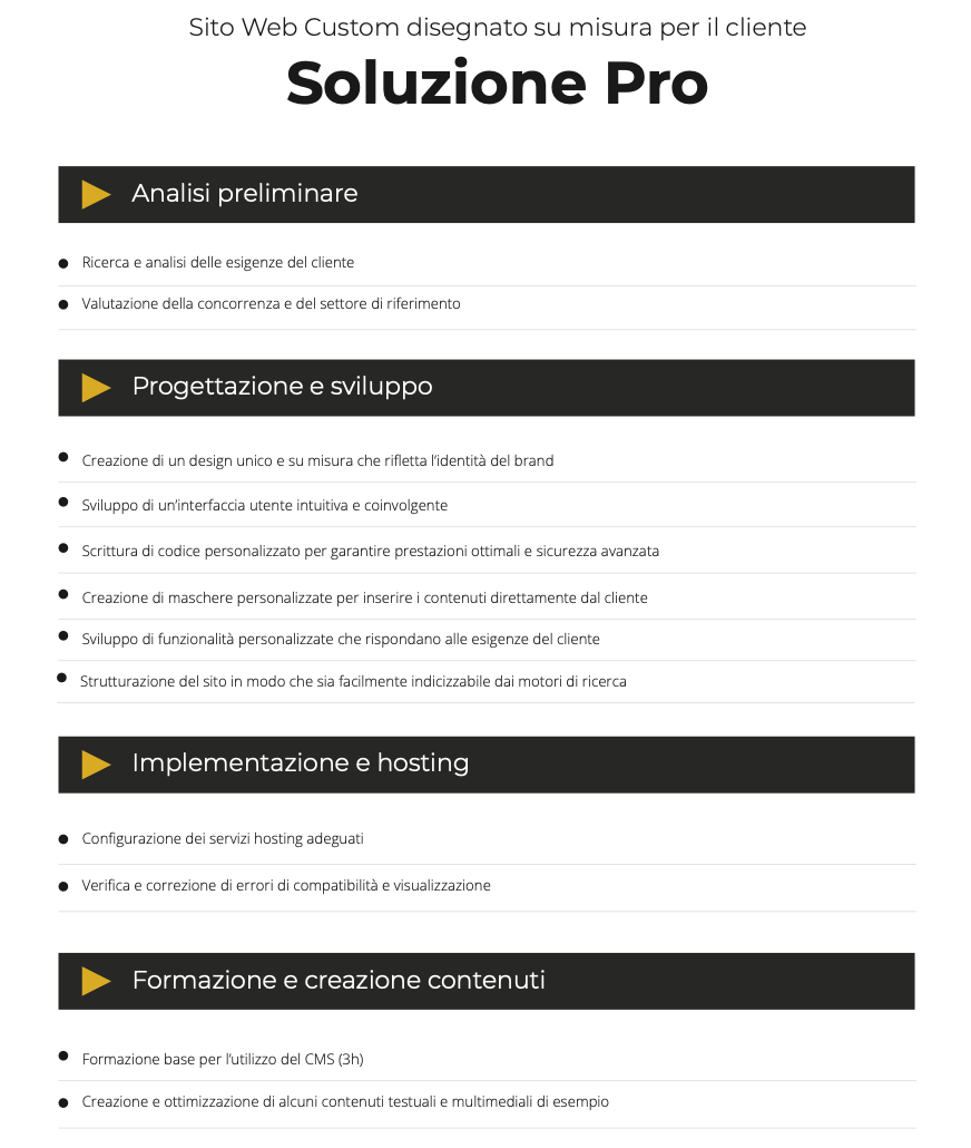 Nessun costo ricorrente, Hosting e sicurezza incluse, Privacy Policy e Legals incluse, assistenza inclusa + 6 aggiornamenti inclusi al mese